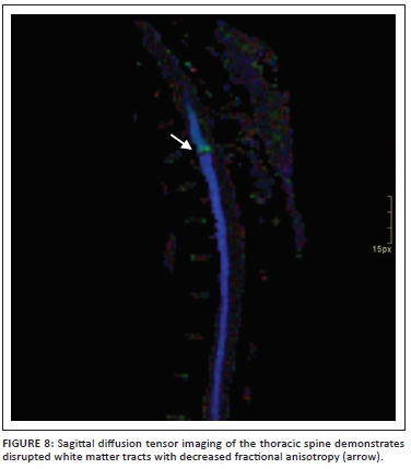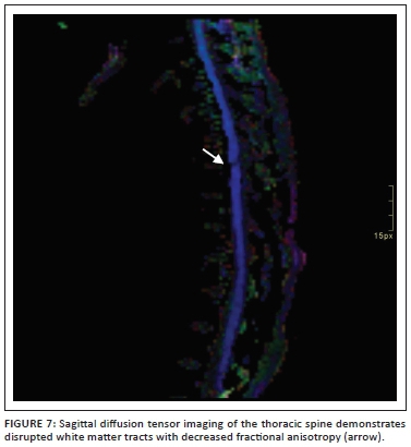 Diffusion tensor imaging was not routinely performed on MRI investigations during the time the study patients received imaging. It was, however, included in some cases, but since no set protocol for imaging existed, only half of the study patients received DTI. Disrupted white matter tracts (Figures 7 and 8), as evidenced by decreased FA, was demonstrated in 72.4% of cases. The small calibre of the spinal cord, CSF flow, patient motion and susceptibility-weighted artefacts are all reasons described in DTI-related studies that may have led to inconclusive findings in five of our study patients.23,24