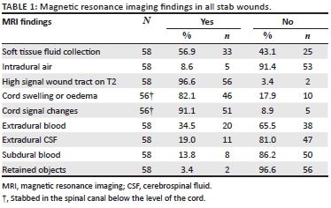 METHOD: Consecutive sampling was used to retrospectively select patients who presented with spinal penetrating injuries secondary to stab wounds during the period 01 August 2013-30 September 2016 and received MRI investigation. Fifty-six patients were included. Magnetic resonance imaging investigations were reviewed by the authors, with documentation of MRI findings, relevant patient demographics and clinical information into Excel spread sheets. Statistical analysis was performed by the Biostatistics Department of the University of the Free State