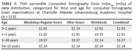 RESULTS: Of the 1031 CT examinations performed, CT brain examination was the most common (755/1031; 72.23%). DLP values were increased in the after-hours categories compared to regular working hours at both hospitals. The largest increase was in the 0-1 year age group (150.56%). With the exception of CT Chest and CT abdomen in the 0-1 year age group, the CTDIvol and DLP values compared favourably to international standards