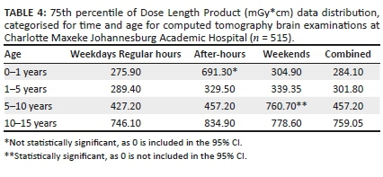 The increased CTDIvol and DLP values for RMMCH compared to CMJAH could be ascribed to hardware and software variables between the two departments. Charlotte Maxeke Johannesburg Academic Hospital Philips machines have more detector rows (64 and 128) as well as utilisation of the i-Dose software by Philips.25,26