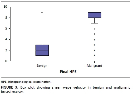 Approximately 74.1% of the malignant masses (n = 63) showed X.XX m/s as the SWV in the lesion on three consecutive measurements, and hence their real stiffness could not be measured. Nakashima et al.4 have stated that the absolute value of SWV in such cases could be obtained by placing an ROI in the mass's periphery and including adjacent breast tissue, but this was not undertaken in this study.