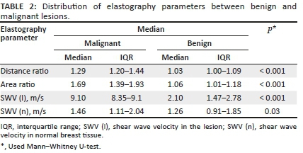 The sample size was calculated assuming that the sensitivity and specificity of SWV for malignant breast tissues would be 95% with a 5% absolute precision and a 5% level of significance. The sample size (73 benign and 73 malignant) was estimated using the statistical formula for determining the sensitivity and specificity of a diagnostic tool.