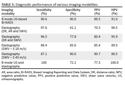Considering all three elastography parameters, DR, AR and SWV, with respective cut-off values for diagnosing malignancy, the sensitivity and specificity were 97.6% and 61.6%, respectively. Similar diagnostic accuracy but better specificity was achieved when AR was excluded and the study considered only DR and SWV (l) for diagnosis (96.5% and 77.8%, respectively). The highest sensitivity and NPV of 100% was obtained for combined imaging utilising B-mode US and SWE. The highest specificity was for B-mode US and SWV with a cut-off value of 3.43 m/s (90%). The SWV (l) showed the highest PPV of 90.7% (Tables 4 and 5).