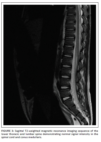 The voiding cysto-urethrogram was normal with no features of vesicoureteral reflux or posterior urethral valves. Magnetic resonance imaging (MRI) of the thoracic and lumbar spine (Figure 3) was conducted to exclude a neurological aetiology. This demonstrated no features of spinal dysraphism or spinal cord abnormality; however, bilateral hydronephrosis was evident as documented on ultrasound. Incidentally, the MRI also demonstrated a homogenous cystic lesion within the prostate gland (Figure 4) with mass effect on the bladder base. Only limited sequences through the prostate were obtained and contrast was not administered. Given the background of failure to respond to medical treatment and the progressive symptoms, a PA was considered as the likely aetiology for the obstructive uropathy.