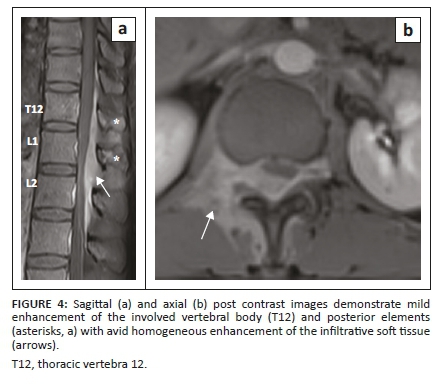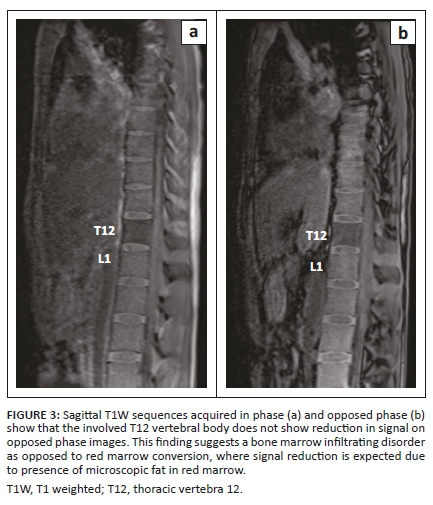 The MRI examination revealed altered signal intensity involving the bodies and posterior elements of the T12 vertebra and L1 vertebra which showed hypointense signal on T1 weighted (T1W) and hyperintense signal on T2W and short tau inversion recovery (STIR) sequences (Figures 1 and 2) with mild enhancement on post contrast images. On chemical shift imaging, the involved vertebral body did not show reduction in signal on opposed phase images (Figure 3). There was a homogeneously enhancing soft tissue mass in the posterior epidural space extending from the T12 to L2 vertebral levels appearing isointense on T1W and hyperintense on T2W and STIR images (Figures 2 and 4). The lesion caused narrowing of the spinal canal with marked compression of the conus medullaris and cauda equina nerve roots. There was associated widening of bilateral neural foramina (right > left) at the T12-L1 and L1-L2 levels, with infiltration of the soft tissue lesion into bilateral paraspinal muscles. A possibility of myeloid sarcoma was suggested given the clinical profile and imaging findings.