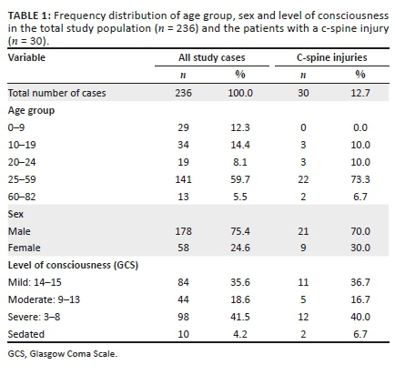 The number of the patients who met the criteria for the study was 236. Of these, 30 (12.7%) presented with concurrent c-spine injury. The demographic and clinical profiles of all 236 TBI patients and the 30 patients with positive findings of a c-spine injury on a CT scan are summarised in Table 1. The predominant age group in both the total study population and in the c-spine injured patients was the 25- to 59-year age group and the majority were male. There were similar initial levels of consciousness of the total population versus the c-spine injured patients. Most patients had a severely decreased level of consciousness.