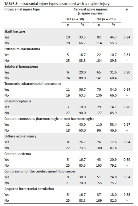RESULTS: A total of 236 patients met the criteria for the study; 30 (12.7%) patients presented with concurrent c-spine injury. Most TBI patients were males (75%) and accounted for 70% of the c-spine injured patients. The most common mechanism of injury with a relationship to c-spine injury was motor vehicle collisions (MVCs) and/or pedestrian vehicle collisions (70%). The risk factors associated with c-spine injury in TBI patients were cerebral contusions (40%), traumatic subarachnoid haematomas (36%) and skull fractures (33.3%). The statistically significant intracranial injury type more likely to have an associated c-spine injury was diffuse axonal injury (p = 0.04).