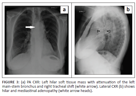 A posteroanterior chest radiograph performed at presentation revealed a left hilar mass with attenuation of the left main-stem bronchus and accompanying contralateral mediastinal shift (Figure 3). Post-contrast staging chest CT (Figure 4) showed an infiltrative, central, trans-spatial mediastinal mass encasing the left main-stem bronchus, left and right main pulmonary arteries and descending aorta. Abdomino-pelvic CT revealed multiple enhancing soft tissue mural lesions in the urinary bladder - consistent with metastases - the largest was located at the bladder base, with a similar lesion located anteriorly - in the space of Retzius - (Figure 5a), and complicated by right-sided hydro-uretero-nephrosis because of infiltration of the right vesico-ureteric junction (VUJ) by the largest deposit (Figure 5b & c). There was no abdominopelvic nodal or solid organ metastatic disease. No enhancing nodules were present in the right renal pelvis. The axial and appendicular skeletal elements were clear of metastases.