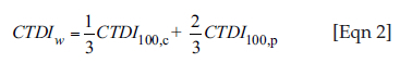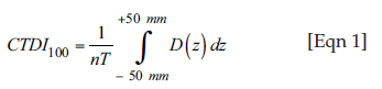 where D(z) is the dose profile along the z-axis, n is the number of slices acquired per rotation and T is the nominal beam width of a single slice (detector row). This gives rise to weighted CTDI (CTDIw), which is a good estimate of the weighted average of absorbed dose throughout the phantom and is calculated using dose measurements around the periphery of the phantom and from its centre,