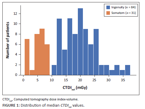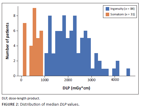 RESULTS: Ingenuity median CTDIvol was 20 mGy and DLP was 2169 mGy*cm; Somatom median CTDIvol was 6 mGy and DLP was 557 mGy*cm. Ingenuity exceeded the United Kingdom's (UK) recommended DRLs by 82% and 214%, respectively. Somatom median CTDIvol and DLP were 45% and 19% lower than UK NDRLs.