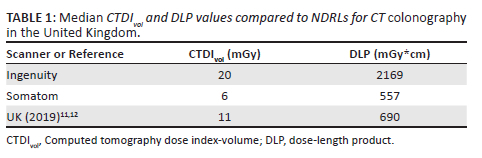 At the time of this publication, NDRLs for diagnostic radiology examinations do not exist in South Africa, and only a few institutions have implemented local DRLs.9 According to its annual report for 2019/2020, the National Metrology Institute of South Africa, together with the International Atomic Energy Agency, had set out to establish DRLs for all hospitals in the country that provide diagnostic radiology services.10 While that project did not materialise, it is continuing in collaboration with local organisations and institutions, and its scope has been expanded to include all clinical indications in the country (S. Jozela, pers. comm., 24 February 2023). Efforts have been made to aggregate the limited data on DRLs for diagnostic imaging procedures in South Africa;9 however, the audit revealed that DRLs have been published for only three types of adult CT examinations, with none pertaining to CT colonography.