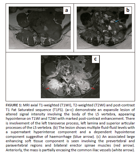 Prior pre- and post-contrast MRI of the lumbo-sacral spine was acquired in January 2023 using a Siemens Magnetom Vida 3T MRI. The study revealed a destructive L5 vertebral body lesion with complete marrow replacement, hypointense on T1 and T2WI with multiple foci of hyperintensity on the Short Tau Inversion Recovery (STIR) sequence. T2W and post-contrast T1FS axial images revealed a large, lobulated soft tissue mass arising from the body of the L5 vertebra and extending into the left anterolateral and posterolateral paraspinal soft tissues. The posterolateral component demonstrated multiple fluid levels on T2WI with a hyperintense supernatant component and a hypointense dependent component, likely representing haemorrhage. The left transverse process, left lamina and both superior articular processes of the L5 vertebra were also involved. The lesion extended intraspinally with encasement of the thecal sac at the L4-L5 and L5-S1 levels resulting in marked compression of the thecal sac. Severe compromise of the L4-L5 and L5-S1 lateral recesses and neural foramina was noted with significant stenosis resulting in compression of both L4 and L5 exiting nerve roots and L5 and S1 traversing nerve roots. Anteriorly, the lesion was abutting the aortic bifurcation and encasing the left iliac vessels, as well as compressing the left lower ureter with ipsilateral hydroureteronephrosis. On the right, there was extension to the right pedicle, right superior articular process and medial portion of the right transverse process of the L5 vertebra (Figure 1 and 2). The MRI findings were suggestive of an aggressive vertebral lesion showing multiple fluid levels, suggestive of GCT and osteosarcoma.12