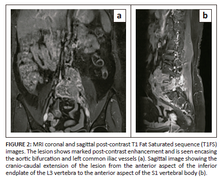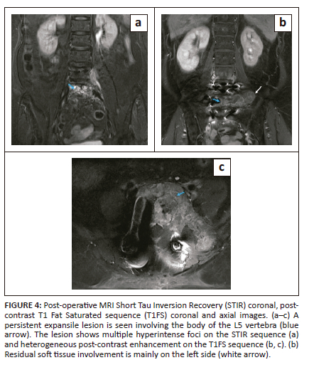 The patient underwent a L4-L5 laminectomy with decompression of the thecal sac in April 2023, with a perceived improvement of symptoms following surgical intervention. A post-operative MRI scan was performed after 1 month. There was a significant reduction of the tumour, as well as in the associated enhancing epidural component and the soft tissue extension in the prevertebral and paravertebral regions (Figure 4). Marked reduction of the adjacent nerve root compression was also seen at this level. Residual soft tissue involvement was predominantly noted involving the left neural foramen with resultant compromise of the left exiting nerve roots. The residual lesion involving the paraspinal soft tissue was seen extending along the left psoas, erector spinae and iliacus muscles. Marked reduction in the size and number of lymph nodes was seen. There was also a marked reduction in the extrinsic compression of the left ureter with no evidence of hydroureteronephrosis.