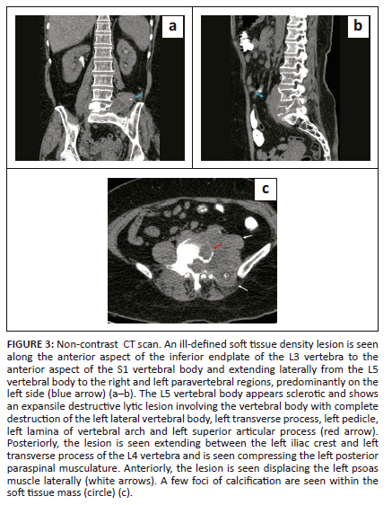 A PET-CT was performed at an external hospital in April 2023. In comparison to the previous MRI, the PET-CT revealed a significant interval increase in the bulk, extent of involvement and metabolic activity of the lesion in and around the L5 vertebra. There was progressive involvement of the left iliacus, bilateral psoas and erector spinae muscles. A few necrotic fluorodeoxyglucose (FDG) avid retroperitoneal and iliac lymph nodes were seen.