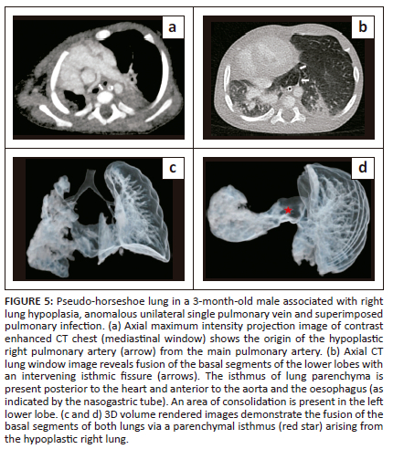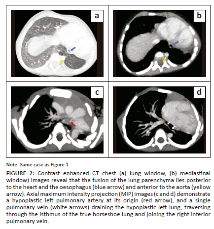 A 2-year-old male presented with complaints of poor weight gain and short stature. On imaging workup, the chest radiograph demonstrated an opaque left hemithorax with volume loss (Figure 1a). Contrast enhanced CT thorax revealed that the left lung was hypoplastic, comprising only the lower lobe. The left upper lobe bronchus was absent, suggesting left upper lobe agenesis (Figure 1b). Fusion of the posterobasal segments of the lower lobes of the right and left lungs was seen posterior to the heart (left and right atria). No isthmic fissure was visible, suggesting true HL (Figure 1c). Superiorly, the isthmus of the midline lung parenchymal tissue extended to the level of the tracheal bifurcation (Figure 1d). The isthmus was located posterior to the oesophagus and anterior to the aorta (Figure 2a, 2b). Bronchial supply to the isthmus was from a branch of the left bronchial artery. The left pulmonary artery was also hypoplastic, and coursed anterior and lateral to the hypoplastic left bronchus (Figure 2c). A single left pulmonary vein was seen traversing through the parenchymal isthmus of the HL and subsequently draining into the right inferior pulmonary vein (Figure 2d). Associated anomalies included duplication of the superior vena cava. The child had no respiratory complaints on initial presentation but was subsequently lost to follow-up.