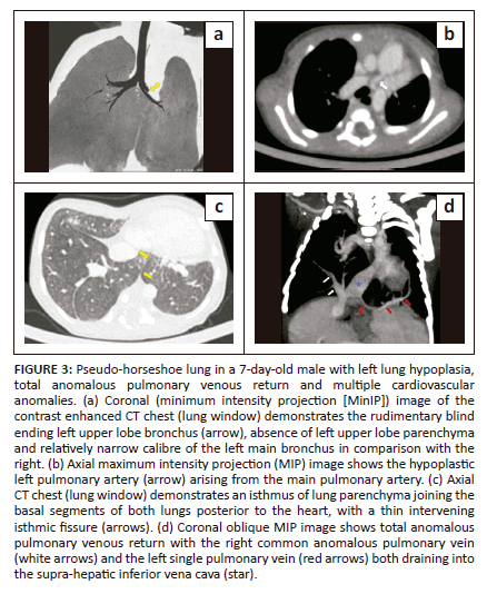 The clinical features of cases with HL mainly depend on the associated congenital malformations. Patients with associated cardiovascular malformations and significant left to right shunts in scimitar syndrome usually present early in infancy with features of respiratory distress or pulmonary arterial hypertension, as seen in case 2, where the child was symptomatic since birth. Patients with associated bronchopulmonary malformations usually present with chest infections (typically recurrent), as seen in cases 3 and 4.7 Air trapping and bronchial stenosis is common in the isthmic segment of the HL and predisposes the patient to recurrent pulmonary infections.