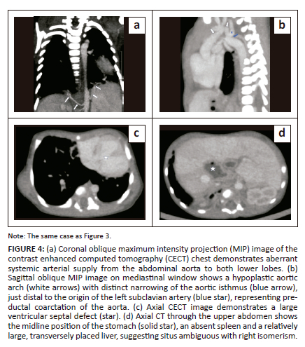 The CECT thorax revealed a hypoplastic left lung with a rudimentary blind ending left upper lobe bronchus and absence of left upper lobe parenchyma, suggesting left upper lobe aplasia (Figure 3a). The left pulmonary artery was also hypoplastic and showed an aberrant course anterolateral to the left main bronchus (Figure 3b). An isthmus of lung parenchyma was seen from the posterobasal segment of the right lower lobe, crossing the midline, and separated from the left lower lobe parenchyma by only a thin fissure, representing pseudo-HL morphology (Figure 3c). The left lower lobe bronchus was normal. Total anomalous pulmonary venous return was present in both lungs, suggesting bilateral scimitar syndrome variants. There was a single pulmonary vein draining the left lung, which continued as an anomalous vein, crossed the diaphragm, and drained into the inferior vena cava (IVC). The superior and inferior pulmonary veins on the right side also combined to form an anomalous common right pulmonary vein, which in turn drained into the supra-hepatic IVC (Figure 3d). Variant fissural anatomy was present in the right lung, with an absent oblique fissure and an incomplete accessory fissure containing the right anomalous common pulmonary vein within it. Aberrant systemic arteries arising from the abdominal aorta were present bilaterally, supplying the lower lobes (Figure 4a). The aortic arch was relatively narrow in calibre and a distinct narrowing of the aortic isthmus was present just distal to the origin of the left subclavian artery, representing pre-ductal coarctation of the aorta with aortic arch hypoplasia (Figure 4b). A large inlet ventricular septal defect was also seen (Figure 4c). Sections of the upper abdomen revealed a midline position of the stomach, absent spleen and a relatively large transversely placed liver, suggesting situs ambiguous with right isomerism (Figure 4d). The cardiovascular anomalies were also subsequently confirmed on echocardiography. Unfortunately, the neonate succumbed to the cardiac complications.