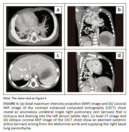 A 3-month-old male presented with features of severe pneumonia and raised total leucocyte counts (20 000/mm3). Chest radiograph (not shown) showed volume loss affecting the right hemithorax with ipsilateral shift of the mediastinum and inhomogeneous parenchymal opacities in both lungs. The CECT revealed hypoplasia of the right lung and right pulmonary artery (Figure 5a). Dextroposition of the heart was present with fusion of the basal segments of the right and left lower lobes in the midline, anterior to the aorta and the oesophagus. The isthmus of lung parenchyma originating from the right lower lobe formed a curvilinear fissure at the junction with the left lower lobe, representing a pseudo-HL morphology (Figure 5b-d). No fissure was present in the hypoplastic right lung. An anomalous unilateral single pulmonary vein was present on the right side, which was tortuous in course, but drained into the left atrium (Figure 6a, 6b). Areas of consolidation were present in both lungs, more on the right. A systemic artery arising from the abdominal aorta was also seen supplying part of the right lower lobe (Figure 6c, 6d). Blood culture revealed Klebsiella sepsis. The child received intravenous antibiotics and respiratory support demonstrating clinical improvement after treatment. No recurrent chest infections were noted on follow-up over the next 6 months.