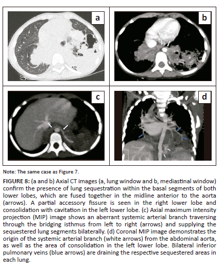 The CECT chest and upper abdomen confirmed the presence of bilateral intralobar lower lobe pulmonary sequestration, with arterial supply from a branch of the descending thoracic aorta at the T11 level (Figure 8 a-c). The branches of this systemic artery were seen to traverse through the midline isthmus from the left to the right (Figure 8c). Venous drainage of the pulmonary sequestration was into the inferior pulmonary veins on either side (Figure 8d). The CT showed consolidation in the left lower lobe, representing superimposed infection. The child showed marked clinical improvement after 2 weeks of intravenous antibiotics and interval surgery was recommended.