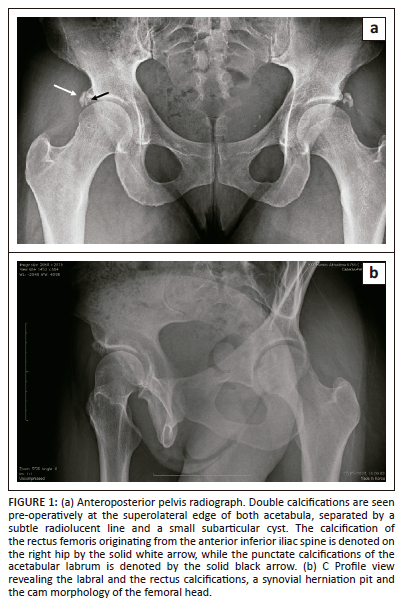 Plain radiographs of her pelvis demonstrated calcifications around the superolateral aspects of both acetabula, a synovial herniation pit, cam morphology and a small subarticular cyst (Figure 1a and Figure 1b). Upon scrutiny, the calcifications were seen arising from two distinct origins. The double calcifications were separated by a subtle radiolucent line, with the calcification of the rectus femoris being round and originating from the anterior inferior iliac spine, while punctate and amorphous calcifications of the acetabular labrum were observed to arise beneath the superolateral rim of the right acetabulum. Similar calcifications were also observed on the contralateral left hip. For other relevant hip imaging parameters, the lateral centre edge angle of the right hip was 30°, the alpha angle was 69°, the Tonnis angle was 8°, and the articular space was normal. Advanced imaging was obtained via MR arthrogram of the right hip, revealing rupture of the anterior-superior labrum with early chondral delamination. The patient was informed of her diagnosis of right hip femoral acetabular impingement (FAI) with chondrolabral rupture and rim calcifications and was advised on surgical intervention in the form of right hip arthroscopy.