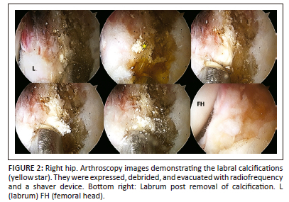 Hip arthroscopy was performed under combined anaesthesia (spinal and general) in the supine position with standard anterolateral (AL), modified anteromedial (MAP) and distal anterolateral (DALA) portals. Interportal capsulotomy was performed to improve central compartment access. Diagnostic arthroscopy revealed a tear of the superior and anterosuperior labrum from 12:00 to 14:00. During probe mobilisation of the ruptured labrum, calcifications were identified anterosuperiorly within the labrum and the capsule-labral recess (Figure 2). During decompression of the subspine region, calcifications were also found within the rectus femoris (direct portion) (Figure 3). These calcifications were easily expressed, debrided and evacuated with radiofrecuency and a shaver device without resection of any labral tissue. It was impossible to retrieve samples from these calcifications because of their punctate nature so no histopathological analysis was performed. The ruptured anterior labrum was repaired with three Iconix (Stryker®) suture anchors. A T-shaped capsulotomy was performed for better visualisation of the femoral neck. There was a large anterolateral cam lesion that underwent femoral osteoplasty with a burr under fluoroscopic guidance. Total capsular closure was performed at the end of surgery.