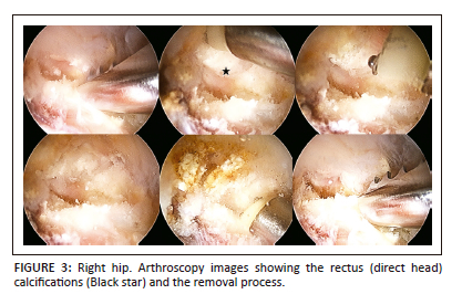 The rectus insertion has been described as a potential site of calcification and pain within the joint. These lesions are often extra-articular on radiography, and they represent a separate pathology to the entities described above as acetabular rim ossifications. Traumatic, genetic and local metabolic factors have been previously postulated as possible mechanisms of calcific tendinitis of the rectus femoris.5 The reflected head that originates at the ilium above the acetabulum is more commonly affected by calcific tendinitis than the straight head.6 Although most cases of calcific tendinitis are self-limiting, patients with moderate to severe discomfort can benefit from treatment options, including endoscopic or arthroscopic excision.7 As a result of the presence of cam deformity in the presented case, ultrasound guided barbotage or lavage and steroid injection were not considered. Recent improvements in hip arthroscopy have allowed for treatment of both intra-articular and extra-articular disorders, with good recovery.