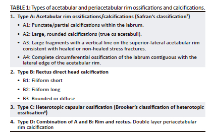 CONTRIBUTION: This case highlights the existence of various types of calcifications around the acetabulum, with a proposed new classification system for acetabular and periacetabular rim ossifications.