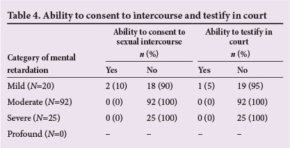Although the present study provided noteworthy findings, the results should be interpreted with care, especially with regard to generalisation. Only rape victims from the Free State Province were referred to the FSPC and were included in the study. A study limitation was that some files were incomplete or not completed correctly. Nevertheless, the study contributes substantially to important data regarding the demographics, degree of mental retardation, ability to testify appropriately in court and ability to give consent to intercourse in mentally retarded rape victims in a field that has been largely neglected in SA.
