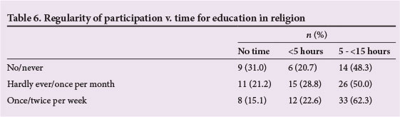 Participants indicated their view regarding the length of time that should be spent on education in religion during the 4-year training period for registrars in psychiatry. No statistically significant differences were found in any of the comparisons (Tables 5 and 6).