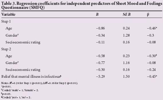 Hierarchical linear regression model (Table 3) was used to determine if the association between depressive symptoms and belief that mental illness is infectious remains after controlling for age, gender and socioeconomic rating. These three variables were entered in the first block. Belief that mental illness is infectious was entered alone in the second block so that its unique contribution to the variance in depressive symptoms controlling for the former variables could be clearly identified.'141 Extensive regression diagnostics showed that the model met the underlying assumptions for linear regression. For example, Normal Probability Plot showed points that were on or close to the line, Durbin-Watson score of 1.72 showed the data met the assumption of independent errors, while Variance Inflation Factor (VIF) scores in the range of 1.05 - 1.25, and Tolerance scores in the range of 0.80 - 0.96 show that multicollinearity was not a concern.[15] Although our sample size was small, the inclusion of four variables in the regression model is consistent with the 'ten cases per variable' recommended by Pallant.[14]