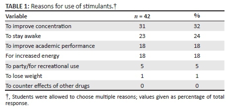 To our knowledge, there is no formal information on non-medical stimulant use at South African colleges or universities. A 2011 report in the South African lay press stated that diversion (where a person with a prescription for stimulants will sell or give his and/or her medication to peers) and the non-medical use of stimulants is fairly common at our universities.10 With this in mind and the fact that the medical fraternity seems to be particularly vulnerable to stimulant use, the aim of this study was to determine the prevalence and correlates of non-medical sympathomimetic use as well as subjective opinion on peer numbers using these drugs and university's attitude towards this use among a sample of undergraduate medical students at a South African university. Specific objectives included: (1) assessing the reasons for use, source of stimulants, effectiveness and medical, as well as psychiatric comorbidities; and (2) students' perception on peer frequency of use and the attitude of the university towards stimulant use. Examples of stimulants included methylphenidate preparations, atomoxetine and modafinil, whereas cognitive abilities were defined as the ability to concentrate/think clearly/learn/remember.
