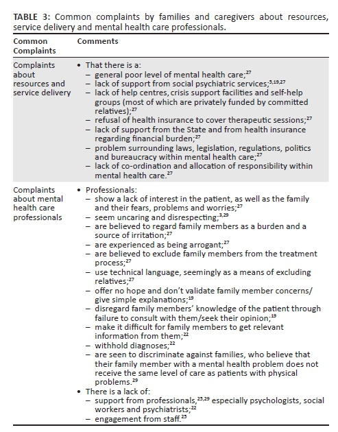 Mental health care resources and levels of service delivery vary greatly worldwide; yet there are definite similarities in the experiences of family members of mentally ill patients dependent on mental health care service. Negative experiences and complaints are in all likelihood highly subjective and generalised. However, whether or not these complaints are fair is another point of discussion. They merit our attention if we wish to succeed in our quest of helping these families. Table 3 presents common complaints about resources, service delivery and mental health care professionals.
