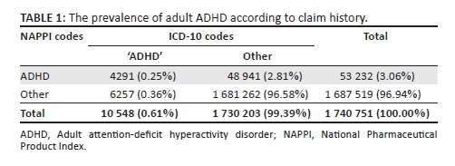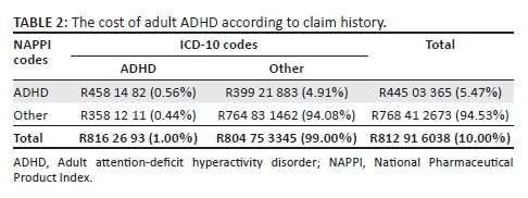 Our 'best estimate' of the prevalence of 'true' adult ADHD according to claim history would, therefore, be those claims that captured both relevant ICD codes and relevant NAPPI codes. These combined codes represented 4291 (0.25%) claims included in the study sample amounting to 0.56% of the total value of claims in the study sample. These direct costs are attributable to medication costs (R1 762 954; 38.48%), psychiatric services (R14 98 14; 3.27%), GP consultation (R2 668 713; 58.25%) and other.