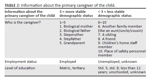 The study attempted to explore the demographic status of the primary and secondary caregivers of each child. The parameters included relation to the child, employment status and educational level. Not enough information was available to draw reliable conclusions for the secondary caregiver and the focus was therefore only on the primary caregiver. As three parameters were explored, less than 3 was regarded as less stable; equal to 3 was regarded as more stable) (Table 2).
