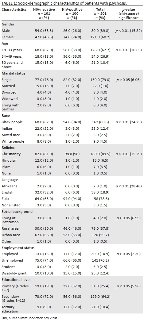 A total of 201 (101 HIV-negative with psychosis and 100 HIV-positive with psychosis) people were identified by a retrospective chart review of consecutive adult patients admitted to King Dinuzulu Hospital Complex with psychosis and confirmed HIV status from 01 January 2011 to 31 December 2013.