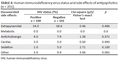 The relationship between HIV status of patients with psychosis and side effects of antipsychotics are presented in Table 4. Seventy-six HIV-infected individuals were on antiretroviral therapy (ART) during the admission. All the patients received antipsychotics. The most commonly used antipsychotic was risperidone (an atypical antipsychotic) in patients with psychosis and HIV and chlorpromazine (a typical antipsychotic) in HIV-negative patients with psychosis. The most common side effect reported was extrapyramidal side effects by all patients and this was slightly higher in the HIV-negative patients.