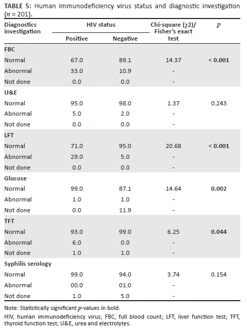 The relationship between HIV status and the diagnostic investigations are presented in Table 5. HIV infection was significantly associated with increased rates of abnormal full blood count (p < 0.001), liver function test (p < 0.001), glucose (p < 0.01) and thyroid function test (p < 0.05) results. Eighty-eight per cent of HIV-infected patients with psychosis had CD4 count results recorded in the psychiatric chart.