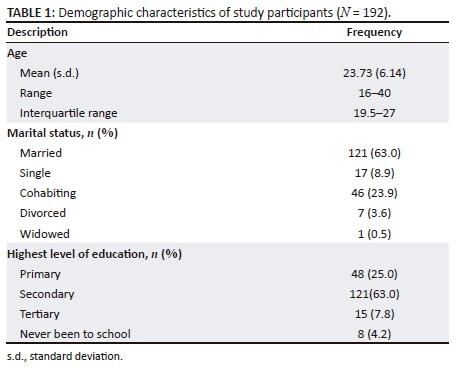 The mean age of the respondents was 23.7 years (standard deviation = 6.14). The majority (n = 166, 86%) of the women were aged between 18 and 30 years. Most (n = 136, 71%) women in our sample had attained secondary school education. Table 1 summarises socio-demographic characteristics of respondents screened using the DSM-5 criteria.