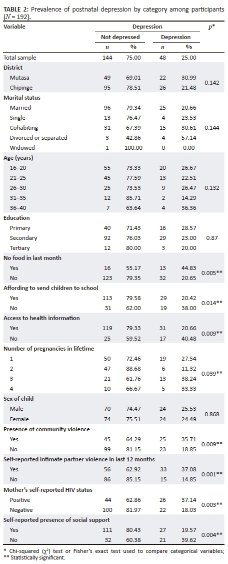 RESULTS: The mean age of participants was 23.7 years (standard deviation = 6.14). Pooled prevalence of PND across the two districts was 26.0% (95% CI: 19.04-31.74). There was a higher prevalence of PND in Mutasa (31.0%) as compared to Chipinge (21.48%) but this was not statistically significant (p = 0.142). Having insufficient food in the household, intimate partner violence and having a child with birthweight under 2500 g significantly increased the likelihood of PND twofold: adjusted odds ratio (aOR) = 2.8 (95% CI: 1.2-6.1), aOR = 2.5 (95% CI: 1.2-5.3) and aOR = 2.4 (95% CI: 1.1-5.6), respectively.