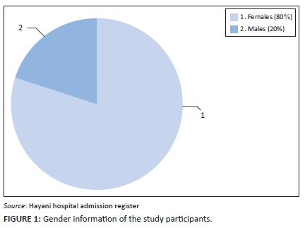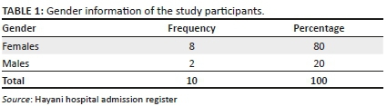 Data revealed that the majority of participants (8; 80%) were women, whilst two (20%) participants were men as illustrated in Table 1 and Figure 1. This is common in Limpopo rural areas because the majority of men had migrated to other provinces in search of jobs, and households were run by women. This is supported by Limpopo province Department of Health's 5-year ( 2015-2020) Strategic Plan report (2015), which stated that Limpopo province's unemployment rate was estimated at 18.1%. Furthermore, women constituted the majority, making up to 52.3% (2.73 million) of province's population.