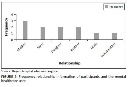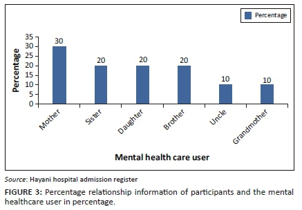 Regarding the relationship of participants with MHCU, the following details emerged: out of 10 participants, three (30%) were mothers, two (20%) were sisters, two (20%) were daughters, and one each was brother (10%), uncle (10%) and grandmother (10%) as shown in Table 2 and Figures 2 and 3. All were biological relatives of male state patients. This is in line with the Social Ecological Model of Human Behaviour, which states human behaviour to be multi-dimensional in individuals and relations.