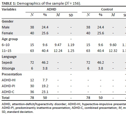 The sample (n = 156) was divided equally in terms of gender (76 boys and 80 girls), aged 6-15 years of age, were recruited from a school-based population in the Tzaneen area in the Limpopo province, South Africa. They were Sepedi and Xitsonga speaking, grade 1-grade 7 learners. The participants were divided into two age groups: 6-10 and 11-15 years. The sample was chosen because of its accessibility. To detect symptoms of ADHD, the learners were screened using the disruptive behavioural disorder (DBD) rating scale, based on ratings from parents and teachers.24,25 A total number of 5480 children were screened for ADHD using the DBD rating scale. Cut-off points were based on the results obtained from a previous study that had been conducted in Limpopo by Meyer et al.5 Learners who met the criteria for ADHD were assigned by the researcher as follows: participants with scores ≥ 17 on the hyperactivity and impulsiveness scale were classified as ADHD-HI presentations and those having a score ≥ 20 on the inattention scale were classified as ADHD-PI presentations, based on the epidemiological study by Meyer et al.5 Participants who met the criteria on both scales, ADHD-HI and ADHD-PI, were categorised as ADHD-C presentations. The cut-off point for the neurotypical control group was set at the 85th percentile or below to decrease the risk for false-positives in the group. Thus, children with scores of less than 15 on the hyperactivity and impulsivity scale and the inattention scale, matched for gender, age and home language, were selected as controls. Children were divided into an ADHD group and a control group, without ADHD symptoms. Seventy-eight children were found positive for ADHD symptoms (ADHD group) and they were matched for gender, age and home language with children without ADHD (control group, n = 78). Children with an intelligence quotient (IQ) lower than 80 and/or who are suffering from any head injury, epilepsy, cerebral palsy, cerebral malaria, autism spectrum disorder or severe psychiatric disorders, as reported on the demographic questionnaire by parents and confirmed by the teachers, were excluded from this study. At the time of testing, the researcher ensured that none of the children were taking psychostimulant medication.