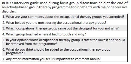 In this study, the researchers focused on adult inpatients' perceptions and experiences of occupational therapy activity-based groups, where an activity was inherent in each group therapy session. The researchers could not find any research articles describing the perceptions and experiences of adult inpatients with MDD regarding occupational therapy activity-based groups. Thompson and Blair25 stated that occupational therapy activity-based groups have been criticised for existing to keep inpatients busy or to exploit free labour. In contrast, Lloyd and Williams26 argued that occupational therapists working in acute inpatient settings require further (1) acknowledgement, (2) reflection and (3) debate.