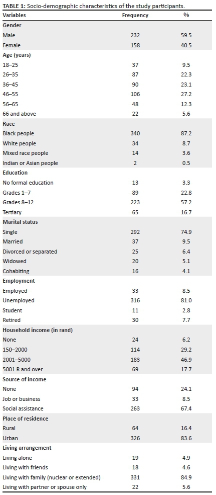 Most of the participants were men (59.5%), black (87.2%) and single (74.9%); had an education level of grades 8-12 (57.2%); and were between 46 and 55 years of age (27.2%). In addition, 81% were unemployed, 67.4% had social assistance (disability grants, pensions and child-care grants) as their source of income and 46.9% had a combined household income of R2000-R5001 per month. The majority of participants lived in urban areas (83.6%) with their families (84.9%) (Table 1).