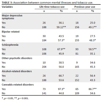 As such, interventions aimed at tobacco use cessation tend to neglect individuals with mental illness. This study examined the prevalence of tobacco use (lifetime and current use) of individuals with mental illness in the Eastern Cape province. Tobacco use increases the risk of mental illnesses and directly interferes with the metabolism of certain psychotropic drugs,8,19 and therefore it deserves attention.