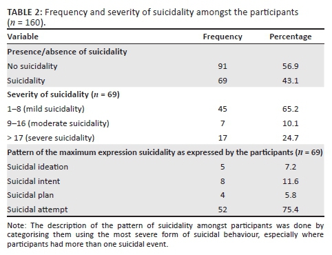 In general, 69 (43.1%) participants had suicidal behaviour out of which 17 (24.7%) had severe suicidality, 7 (10.1%) had moderate suicidality whilst 45 (65.2%) had mild suicidality.