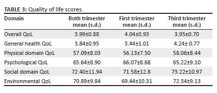 In the mane, the third trimester of pregnancy was significantly associated with being single and having a poor QoL in the general health domain, psychological domain and environmental domain of QoL. More so, there was a significant association between older age and poor QoL in the psychological domain and social domain of QoL. Likewise, having two or more children and a history of a previous caesarean section was significantly associated with having a poor QoL in the physical domain of QoL.