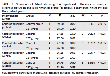 The result confirmed that combined CBT and SST had a significant therapeutic effect on CD amongst in-school adolescents. During week 6 of the intervention, there was a significant difference on the level of CD at week 6 (t[8] = 2.530, p < 0.05) and week 8 (t[8] = 12.728, p < 0.05) of the intervention.