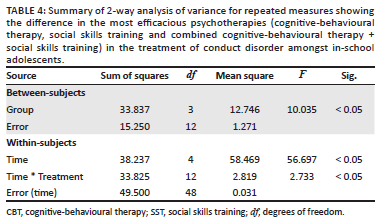 As summarised in Table 5, our research findings show that the three therapeutic techniques, CBT, SST, and CBT + SST, are independently effective in managing CD amongst in-school adolescents. However, CBT + SST appear to be more significantly effective in the management of CD.