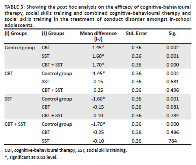 Findings from Table 5 show that the three therapeutic techniques CBT, SST and CBT and SST combined are independently effective in the management of CD amongst in-school adolescents. However, CBT + SST shows itself to be significantly more effective in the management of CD amongst in-school adolescents in Ibadan. This thus confirmed the fourth hypothesis, which states that combined CBT and SST will be more efficacious than each treatment received alone.